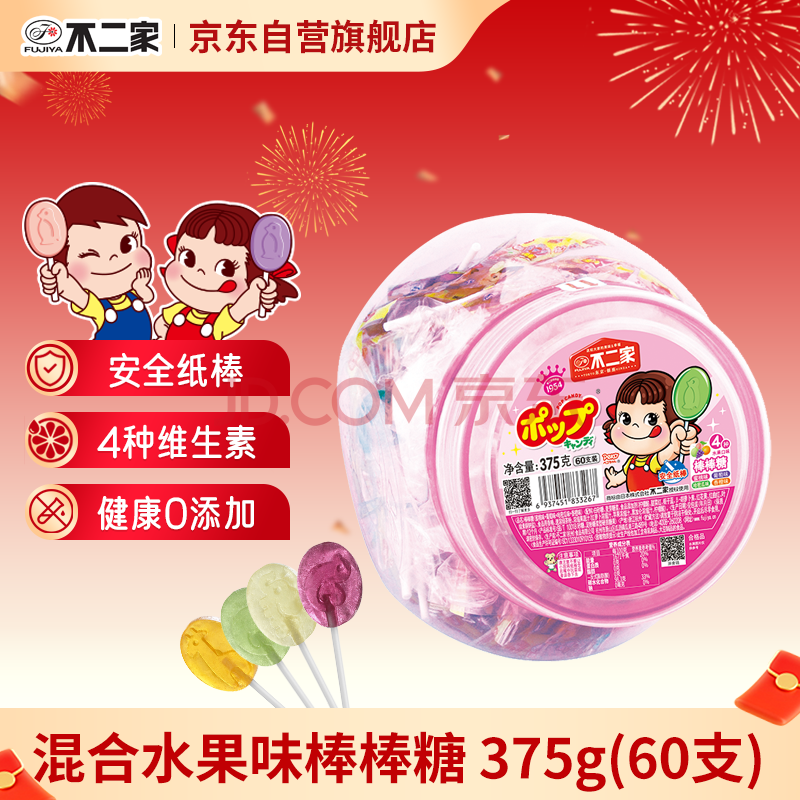 不二家 混合水果味棒棒糖 375g(60支)桶装 儿童糖果 休闲零食 38节礼物
